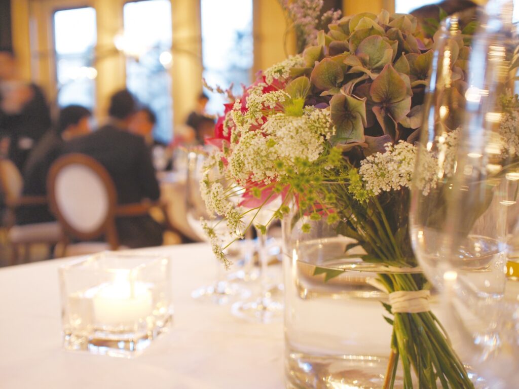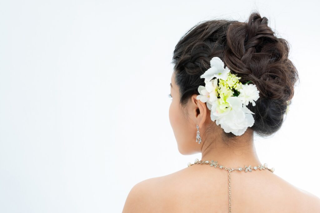 ヘアスタイルはアップにすると縦のラインが強調され、ロングベールや縦長のブーケも全体のバランスを整えるのに役立ちます。